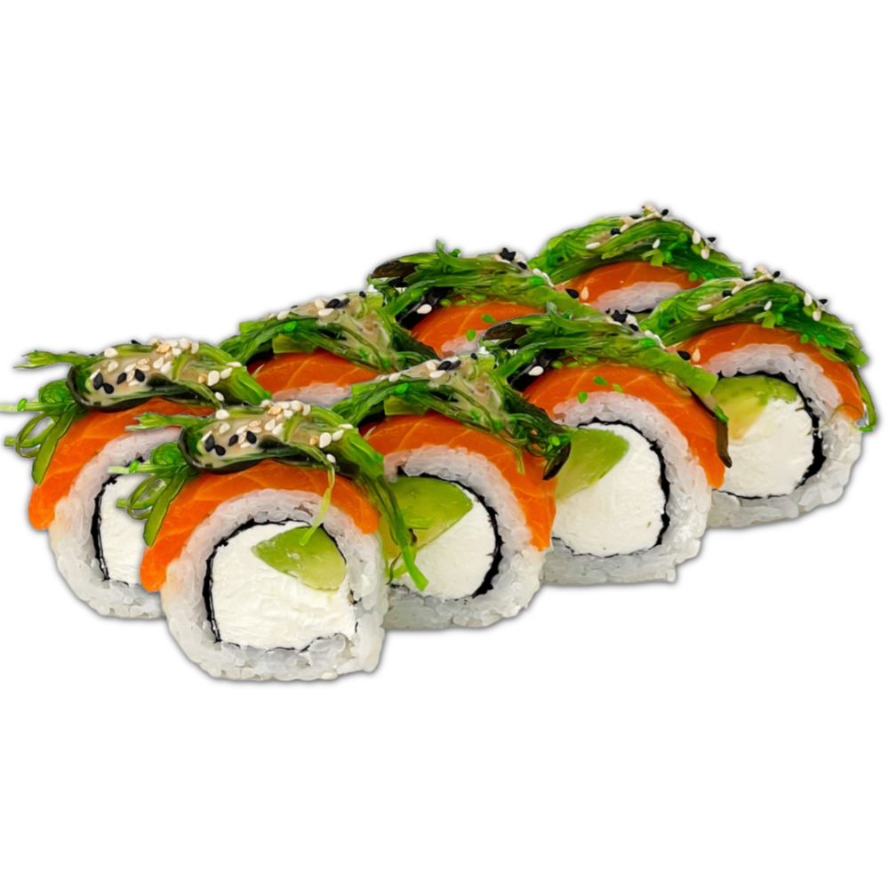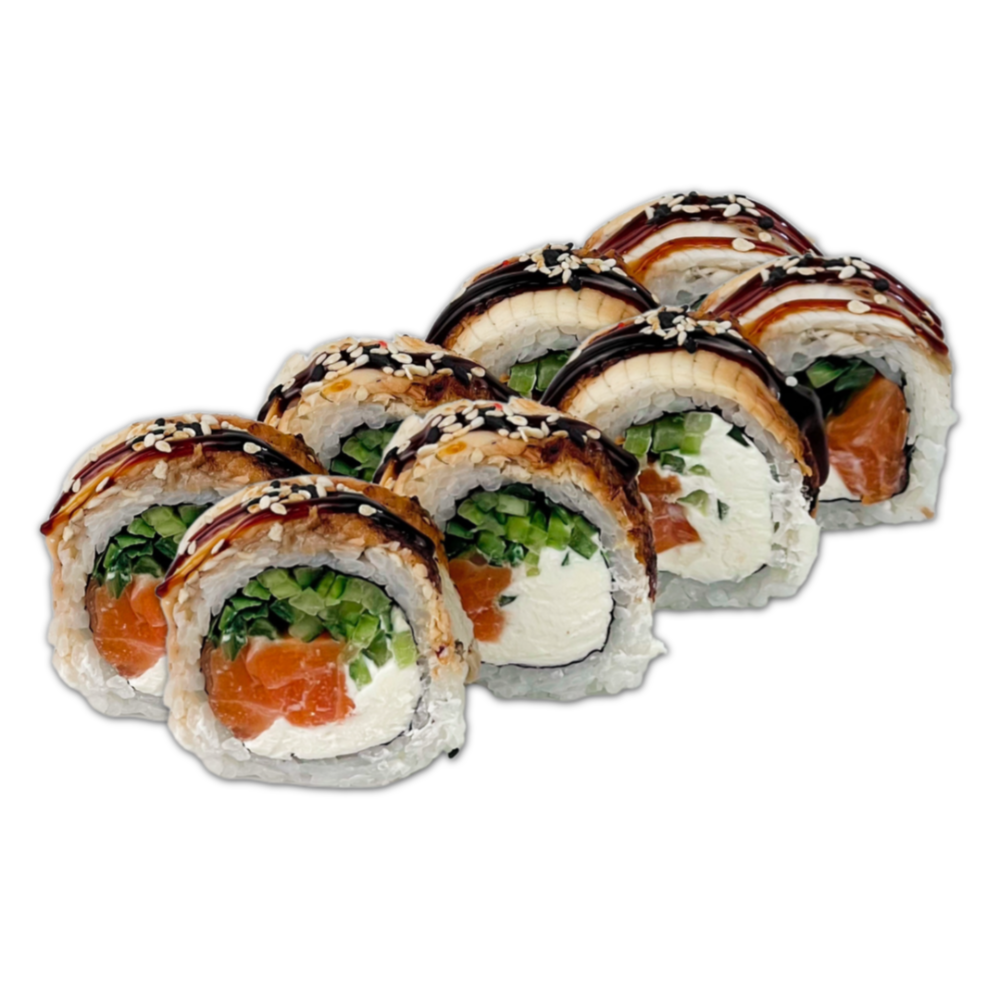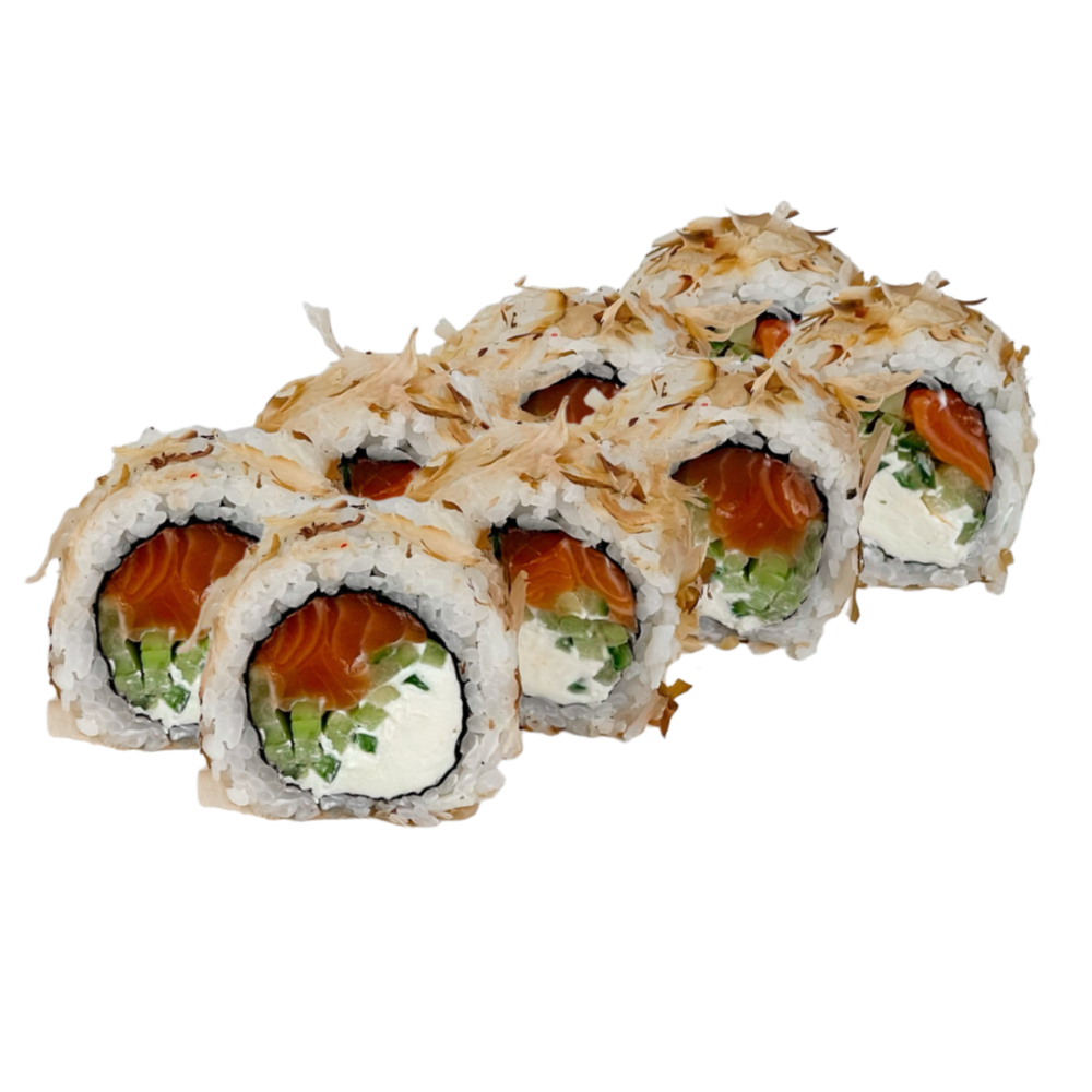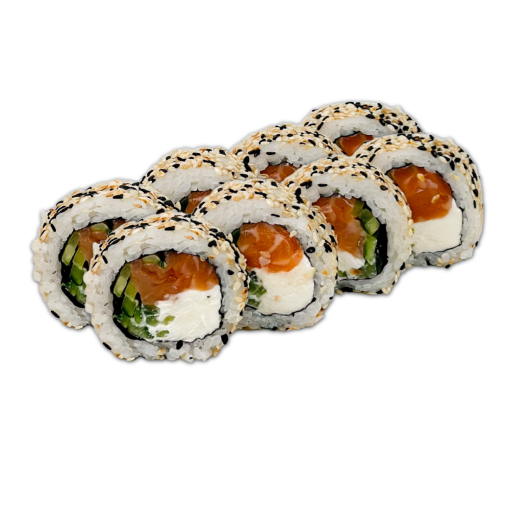 Склад: Рис, норі, вершковий сир,смажений лосось,огірок, кунжут, унагі.