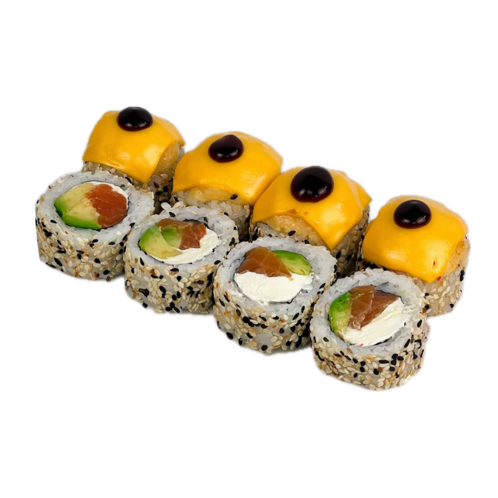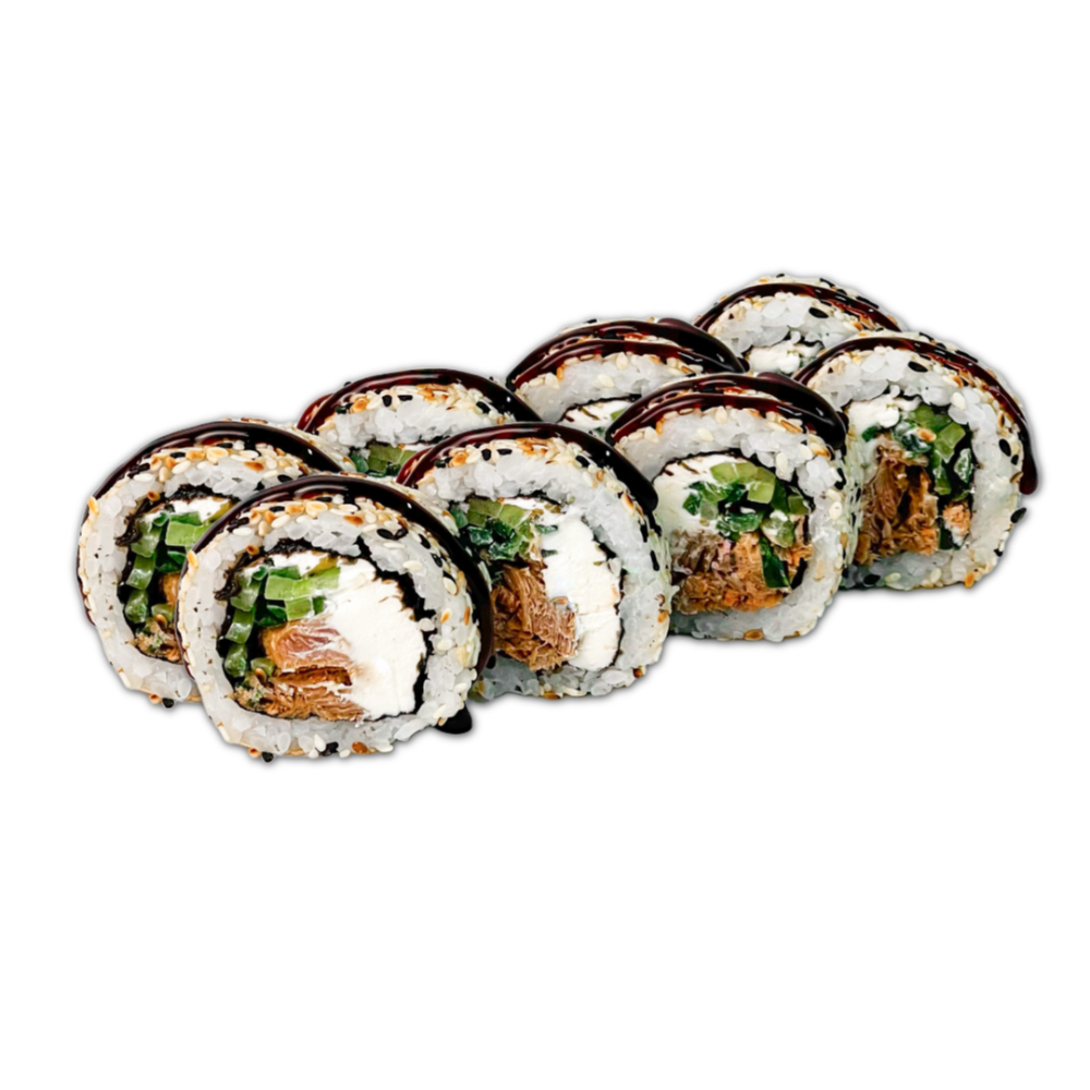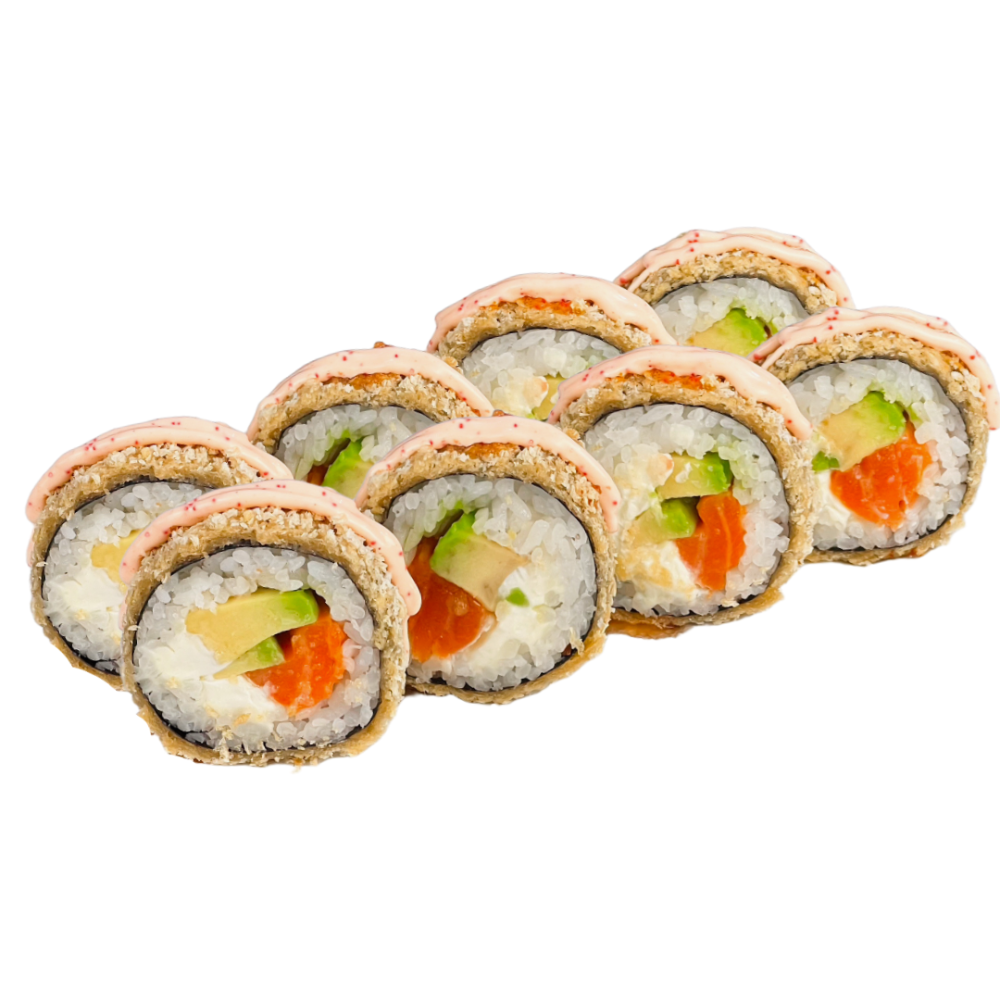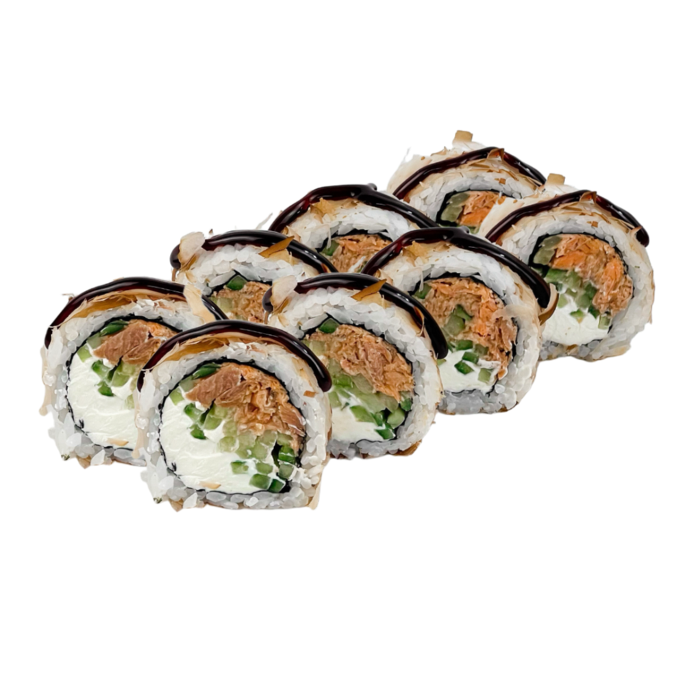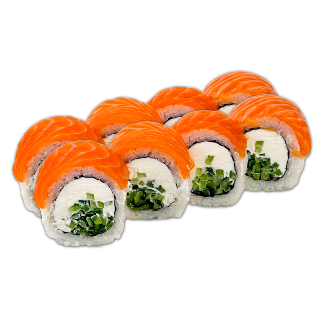 Склад: Рис, норі, вершковий сир,смажений лосось,огірок, кунжут, унагі.