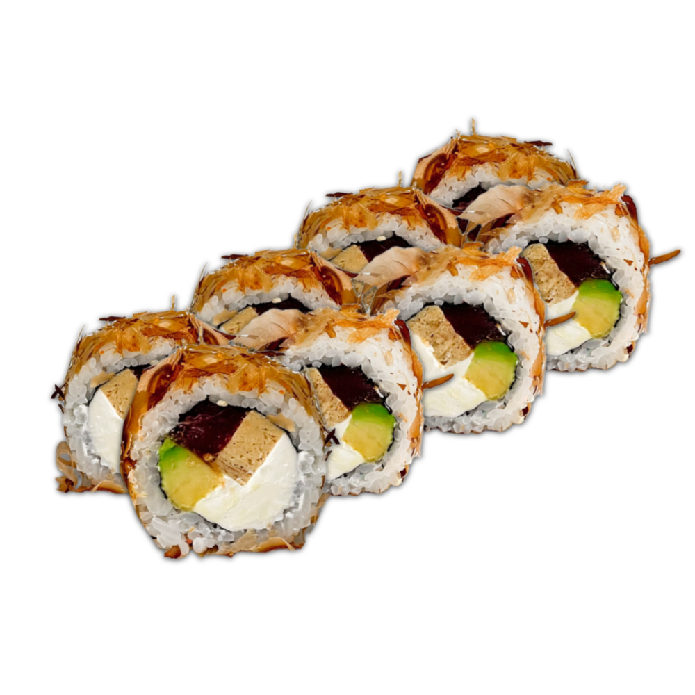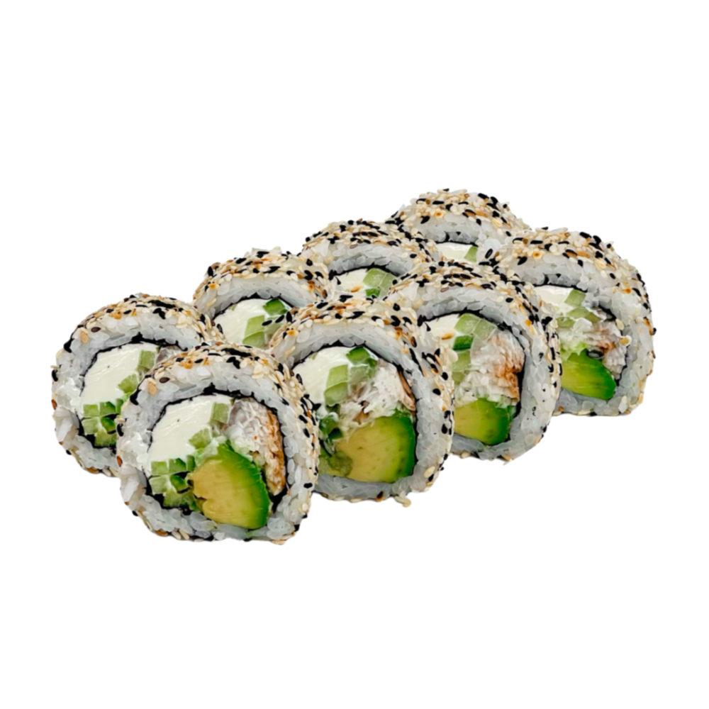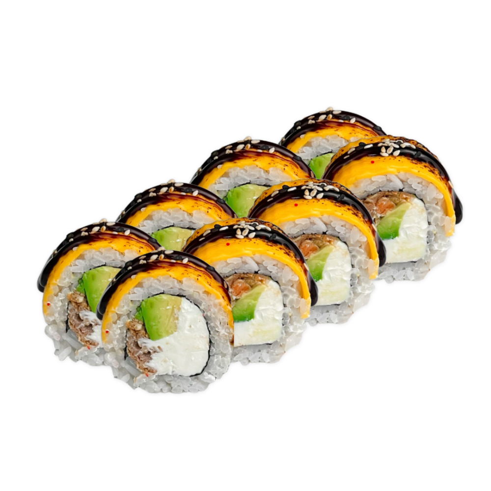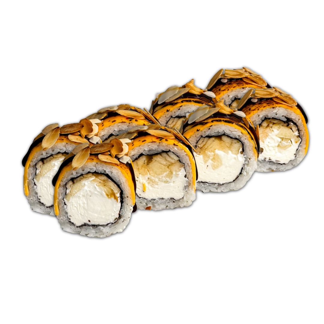 Склад: Рис, норі, вершковий сир,смажений лосось,огірок, кунжут, унагі.