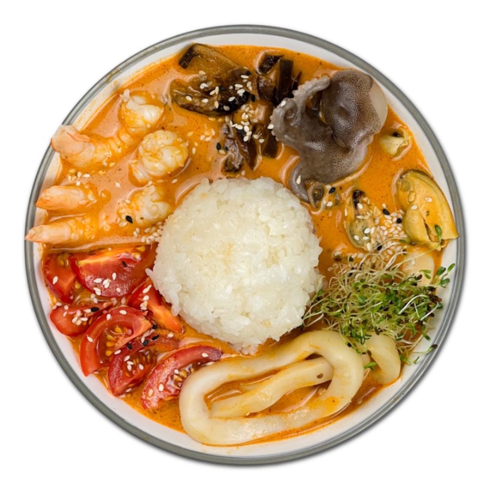Склад:креветка тигрова, мідії, кальмар, восьминіг, чері, гриби шиїтаке, рис на пару, том ям паста, кокосове молоко, соус устричний, рибний соус, кінза, мікс кунжуту, вода